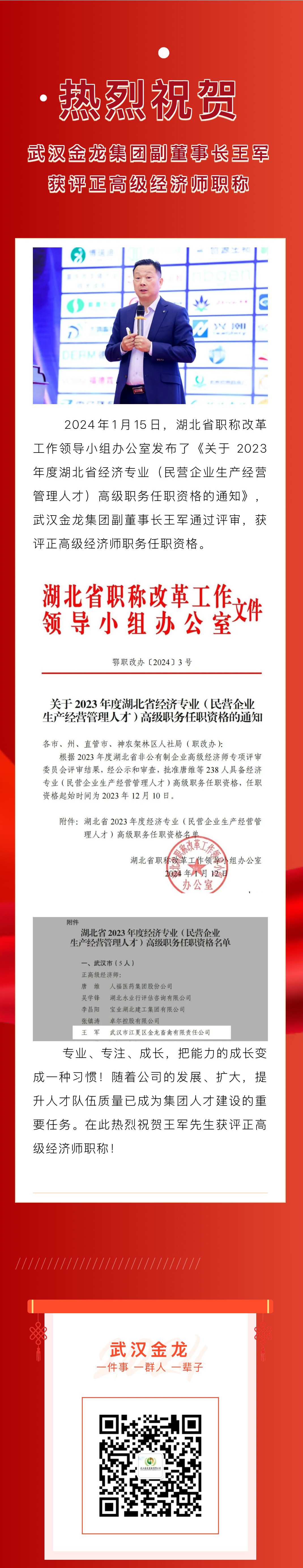 熱烈祝賀|武漢金龍集團副董事長王軍獲評正高級經(jīng)濟師職稱